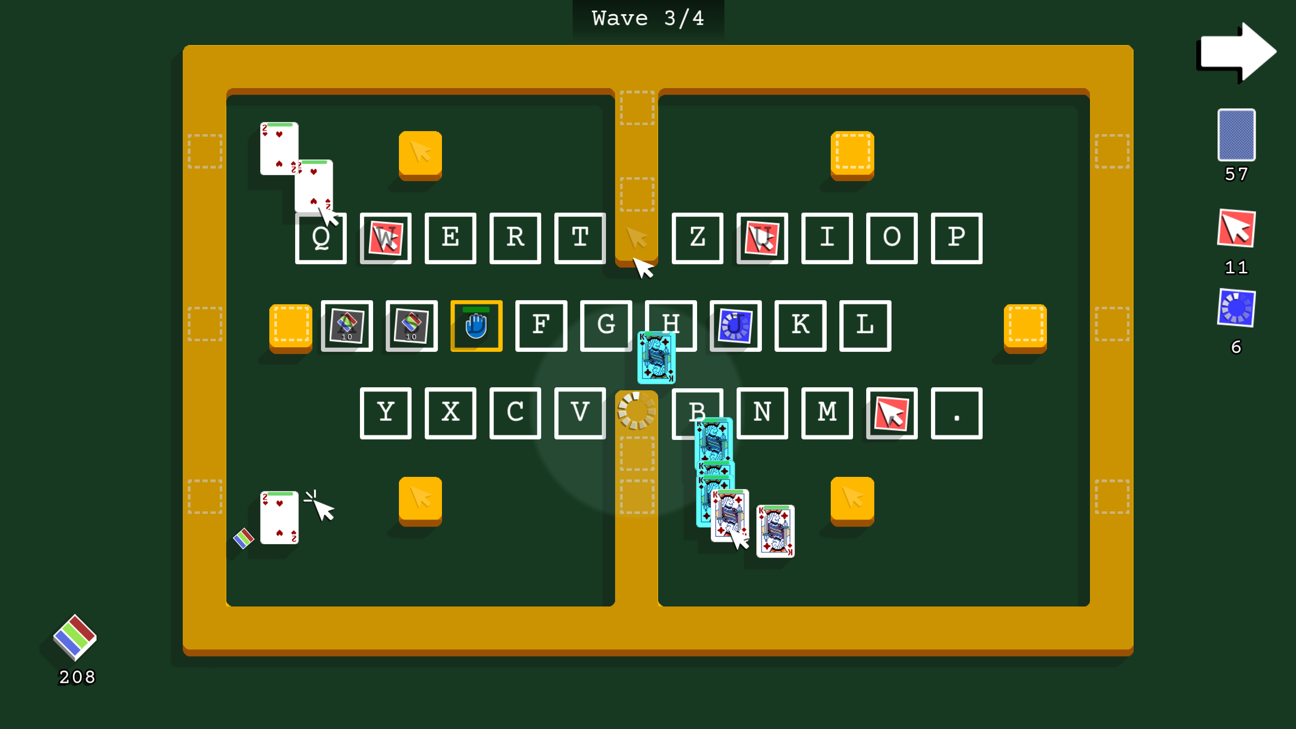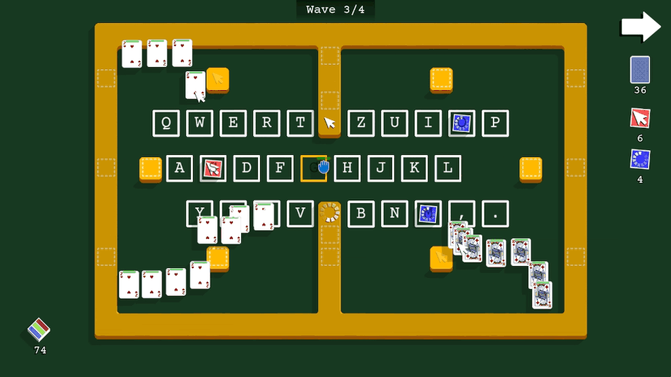 Place your defense, start a new wave and look for power ups appearing on your keys. Use your real keyboard to collect power ups boosting your defense and your run.